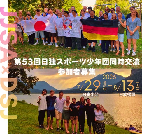 第53回日独スポーツ少年団同時交流(派遣)における日本団派遣候補者(団員・引率指導者)の参加意向調査について お知らせ 2026.01.13 01_(第53回日独スポーツ少年団同時交流(派遣)における日本団派遣候補者(団員・引率指導者)の参加意向調査)ダウンロード 02_第53回日独同時交流(派遣)実施要項(案)ダウンロード 03_日独スポーツ少年団同時交流紹介資料ダウンロード 04_参加者募集ポスター(ひな形)ダウンロード 05_【別紙】参加意向希望書ダウンロード